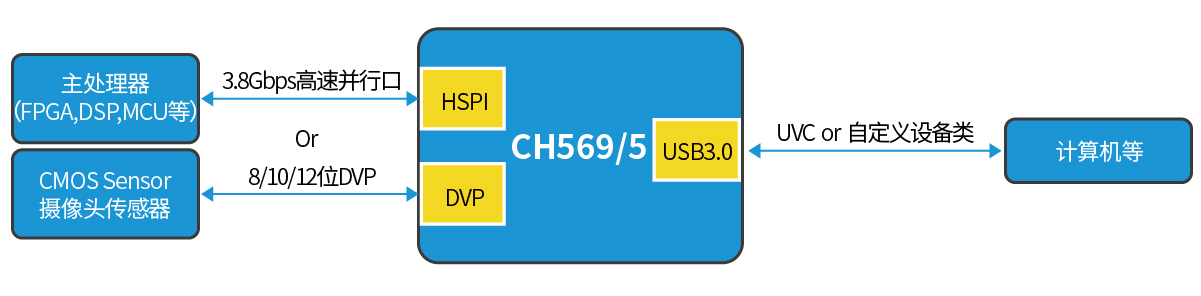 USB3.0 FIFO应用,CH569芯片一端通过高速并行口(3.8Gbps)与主处理器(FPGA,DSP,MCU等)连接,或者直接通过标准DVP接口连接摄像头Sensor,另一端通过USB3.0接口(UVC或者自定义设备类)与计算机等主机相连,实现超高速USB3.0 FIFO功能,可广泛应用于工业相机,USB3.0 摄像头,数字视频摄录机,视频采集卡,医疗成像设备等等。