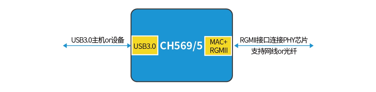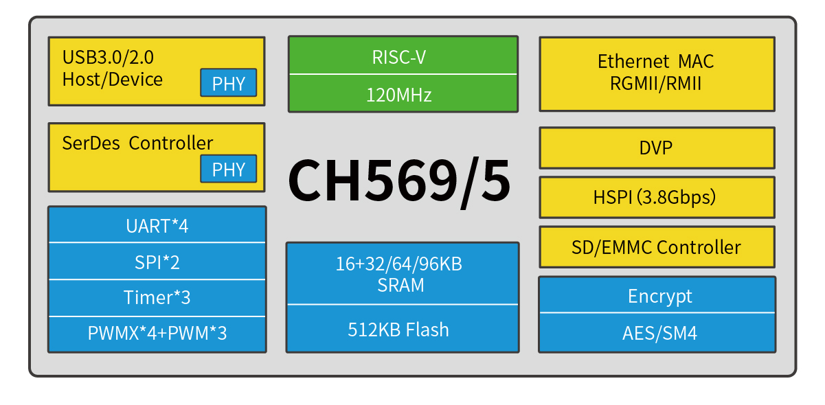 CH569/565 片上集成超高速USB3.0主机和设备控制器(内置 PHY)、千兆以太网控制器、专用高速 SerDes 控制器(内置 PHY,可直接驱动光纤)、高速并行接口HSPI、数字视频接口(DVP)、 SD/EMMC 接口控制器、加解密模块 , 片上 128 位宽 DMA设计可保障大数据量的高速传输, 可广泛应用于流媒体、即时存储、超高速USB3.0 FIFO、通讯延长、安防监控等应用场景。