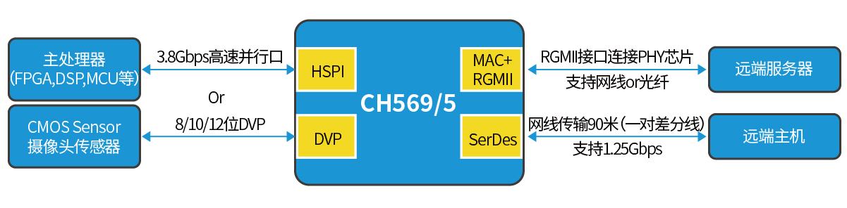 高速数据流远传应用,CH569芯片一端通过高速并行口(3.8Gbps)与主处理器(FPGA,DSP,MCU等)连接,或者直接通过标准DVP接口连接摄像头Sensor,另一端通过以太网接口(RGMII外接千兆PHY芯片,支持光纤或者网线)将高速数据流远传至远端服务器。或者通过SerDes接口,仅借助1组差分线网线传输90米(成对使用,直接光纤可支持更远距离传输),可广泛应用于监控摄像头,监控照相机,网络相机等等。