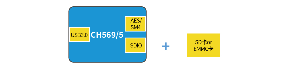 USB3.0超高速加密U盘应用, CH569芯片内置USB3.0超高速接口、SDIO接口以及AES/SM4加密算法。其中USB超高速接口用于连接电脑,SDIO接口用于接SD卡、TF(MicroSD)卡。可通过AES/SM4加密单元对SD卡数据进行加密存储,实现USB3.0超高速加密U盘应用。