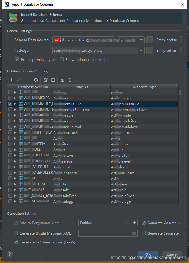 选择上面配置的数据源,并在中找到需要生成的对应的数据库表。