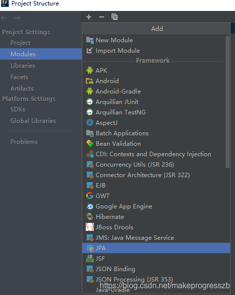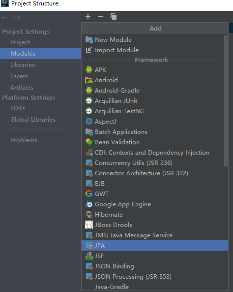 File—>Project Structure—>model—> + —>JPA
