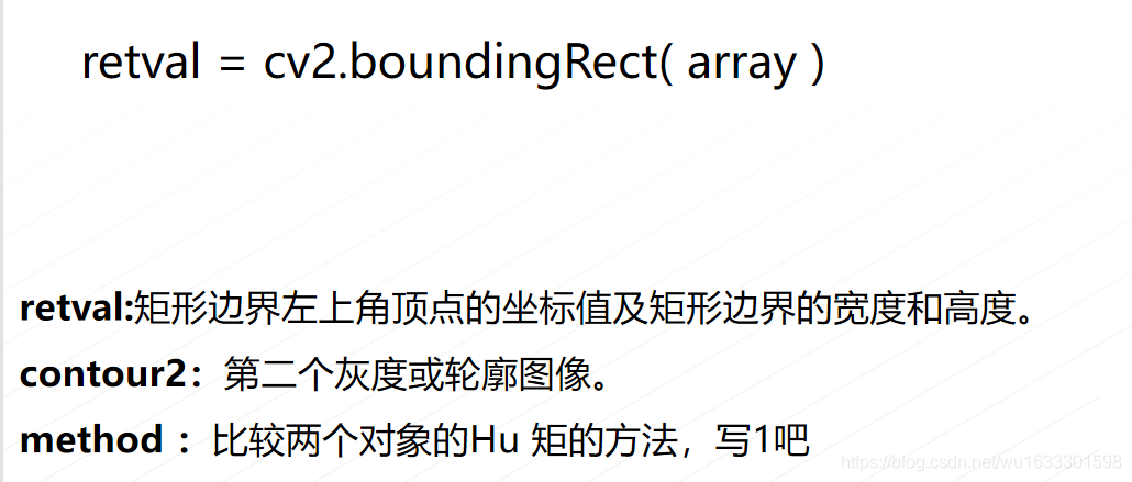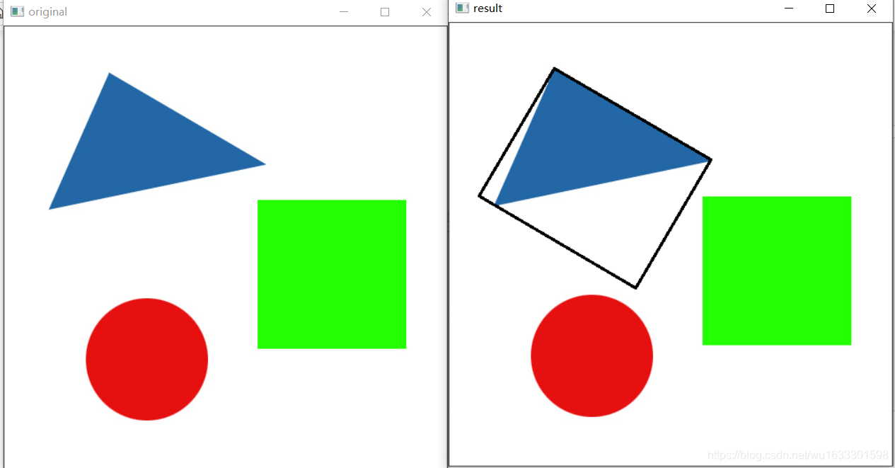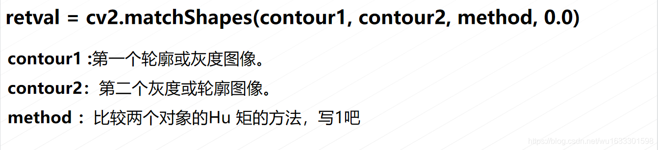 通过Hu 矩可以来判断两个对象的一致性。但是结果比较抽象,OpenCV 提供了 cv2.matchShapes() 对两个对象的Hu矩进行比较。