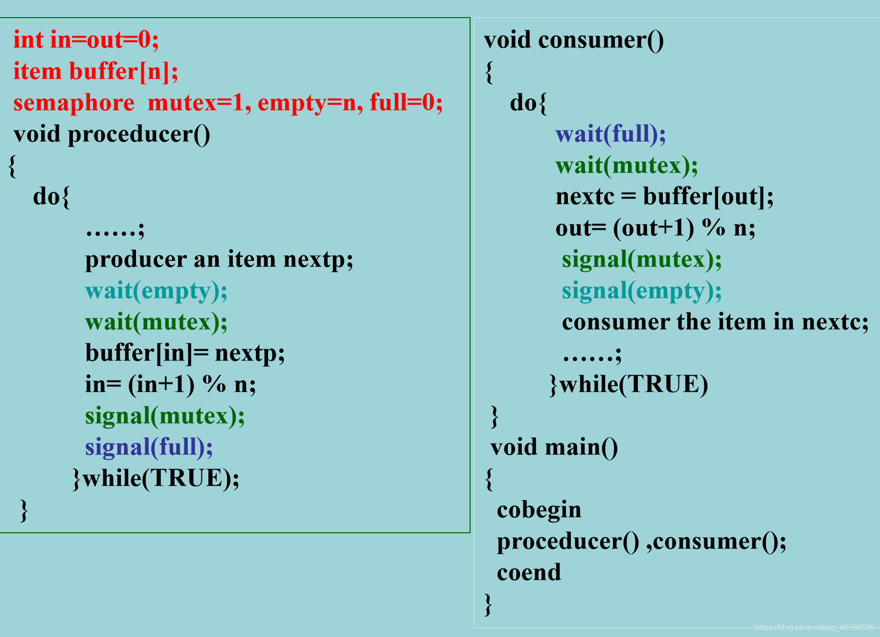 假定在生产者和消费者之间的公用缓冲池中,具有n个缓冲区, 这时可利用互斥信号量mutex实现诸进程对缓冲池的互斥使用; 利用信号量empty和full分别表示缓冲池中空缓冲区和满缓冲区 的数量。只要缓冲池未满,生产者便可将消息送入缓冲池;只要缓冲池未空,消费者便可从缓冲池中取走一个消息。 对生产者—消费者问题可描述如下: