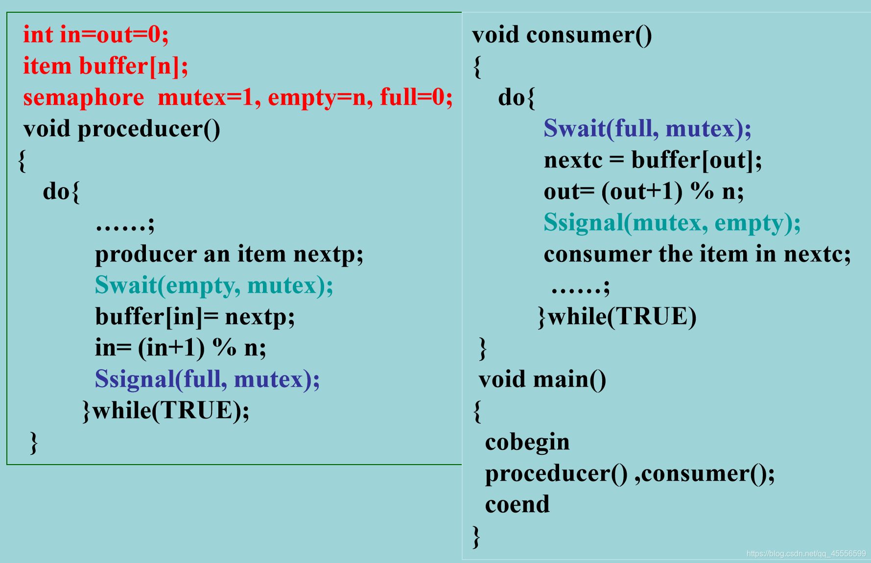 在生产者—消费者问题中应注意:首先,在每个程序中用于实现互斥的wait(mutex)和signal(mutex)必须成对地出现; 其次,对资源信号量empty和full的wait和signal操作,同样需要成对地出现,但它们分别处于不同的程序中。例如,wait(empty)在计算进程中,而signal(empty) 则在打印进程中,计算进程若因执行wait(empty)而阻塞,则以后将由打印进程将它唤醒;最后,在每个程序中的多个wait操作顺序不能颠倒。应先执行对资源信号量的wait操作,然后再执行对互斥信号量的wait操作,否则可能引起进程死锁。