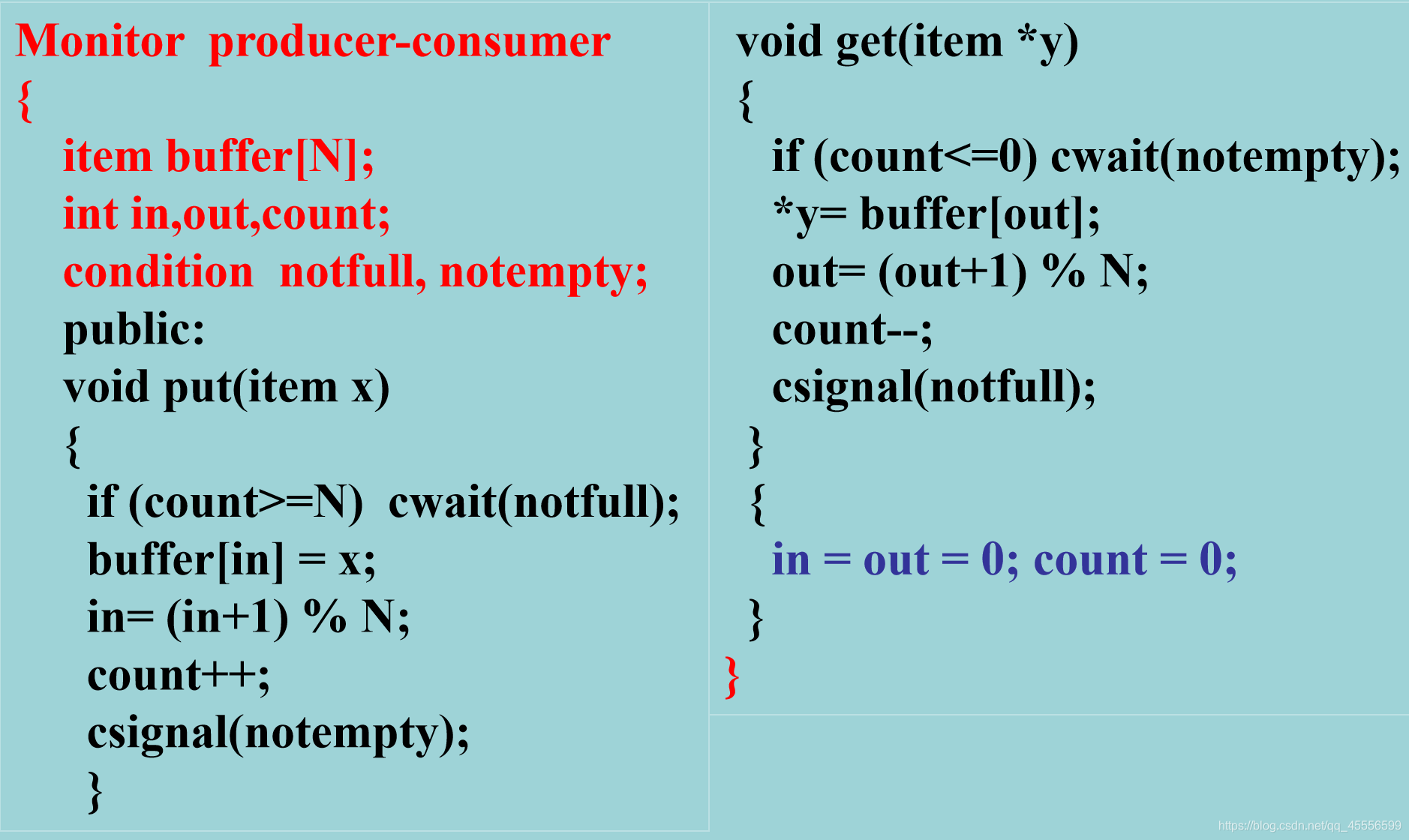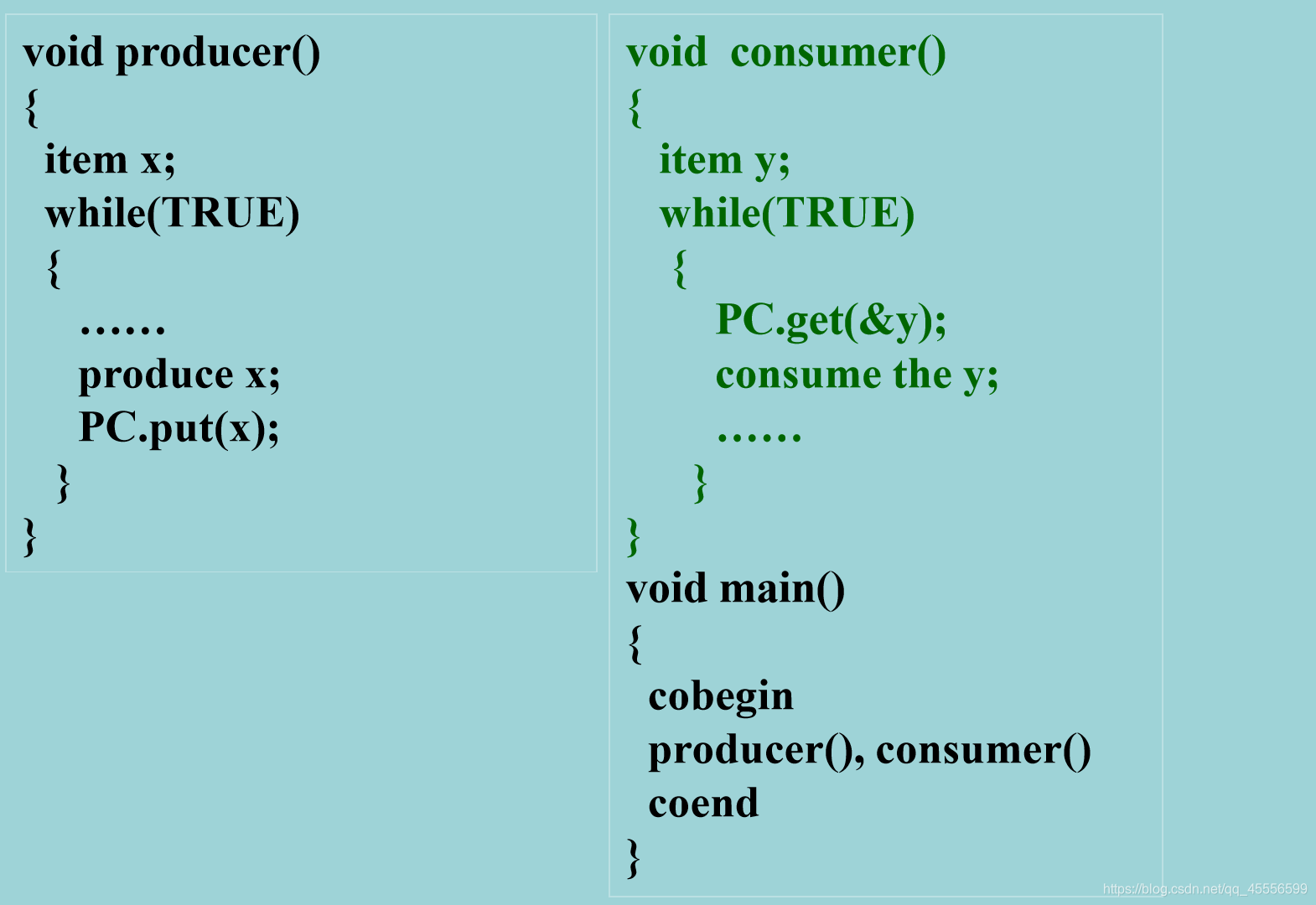 在利用管程方法来解决生产者-消费者问题时, 首先便是为它们建立一个管程,并命名为Proclucer-Consumer, 或简称为PC。其中包括两个过程:
