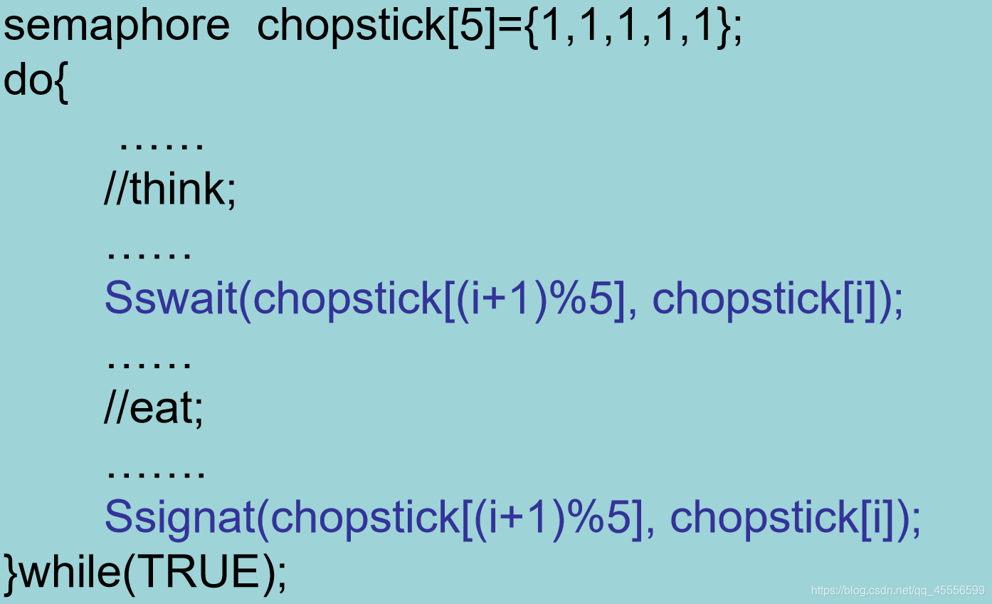 (1) 至多只允许有四位哲学家同时去拿左边的筷子, 最终能保证至少有一位哲学家能够进餐,并在用毕时能释放出他用过的两只筷子,从而使更多的哲学家能够进餐。