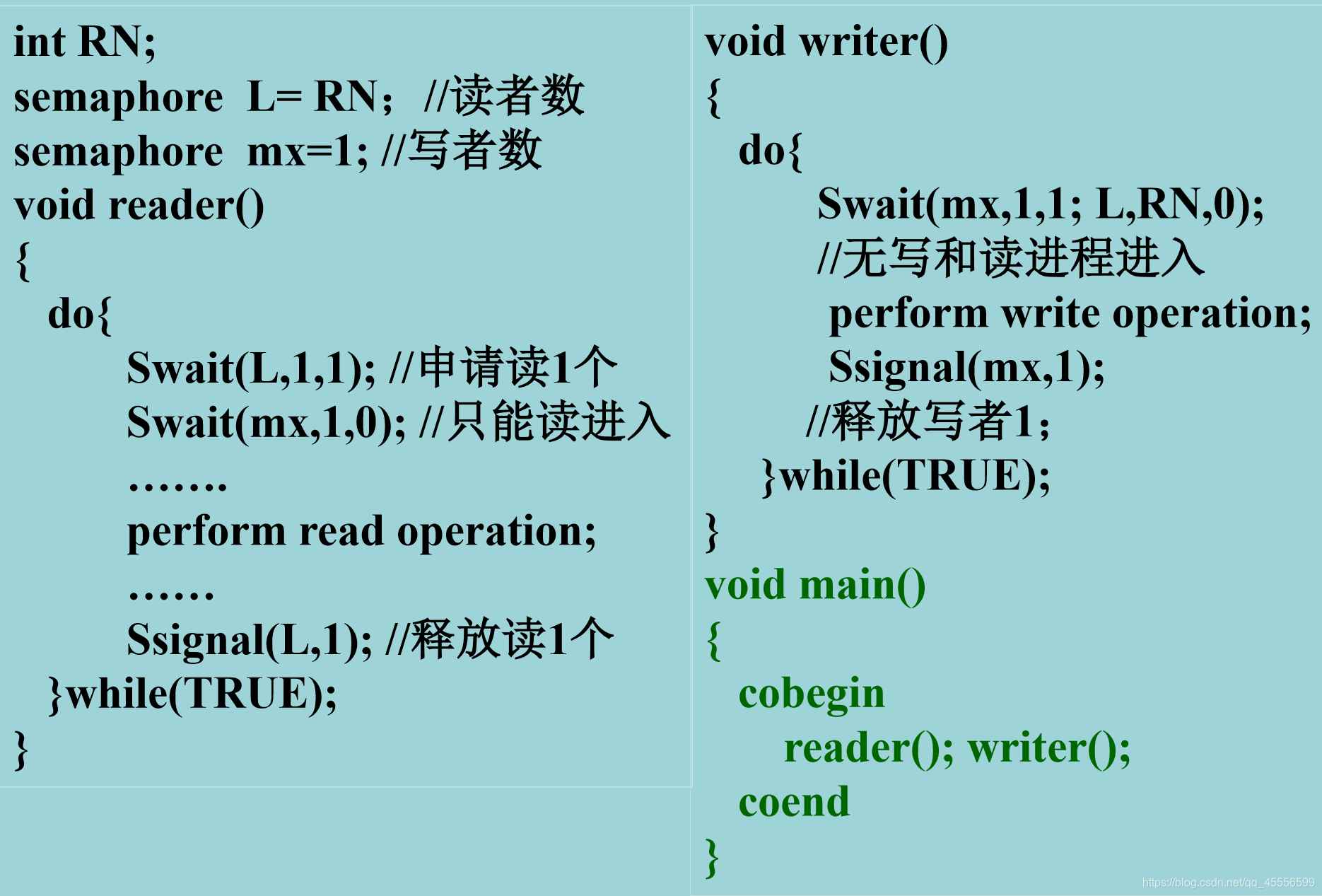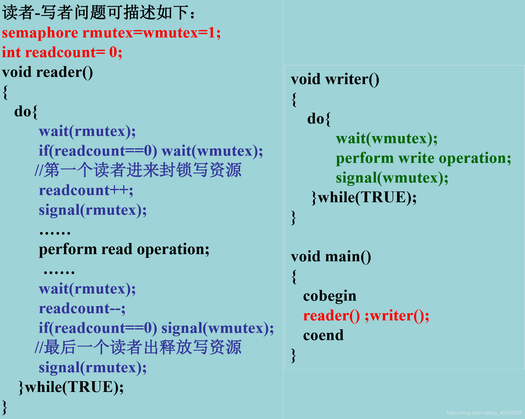 (3)写者之间也不能同时。为实现Reader与Writer进程间在读或写时的互斥而设置了一个互斥信号量Wmutex。另外,再设置一个整型变量Readcount表示正在读的进程数目。 仅当Readcount=0, Reader 进 程 才 需 要 执 行 Wait(Wmutex) 操作。 若 wait(Wmutex)操作成功,Reader进程便可去读,相应地,做Readcount+1 操作。同理,仅当Reader进程在执行了Readcount减1操作后其值为0时, 才须执行signal(Wmutex)操作,以便让Writer进程写。又因为Readcount 是一个可被多个Reader进程访问的临界资源,因此,应该为它设置一个互斥信号量rmutex。