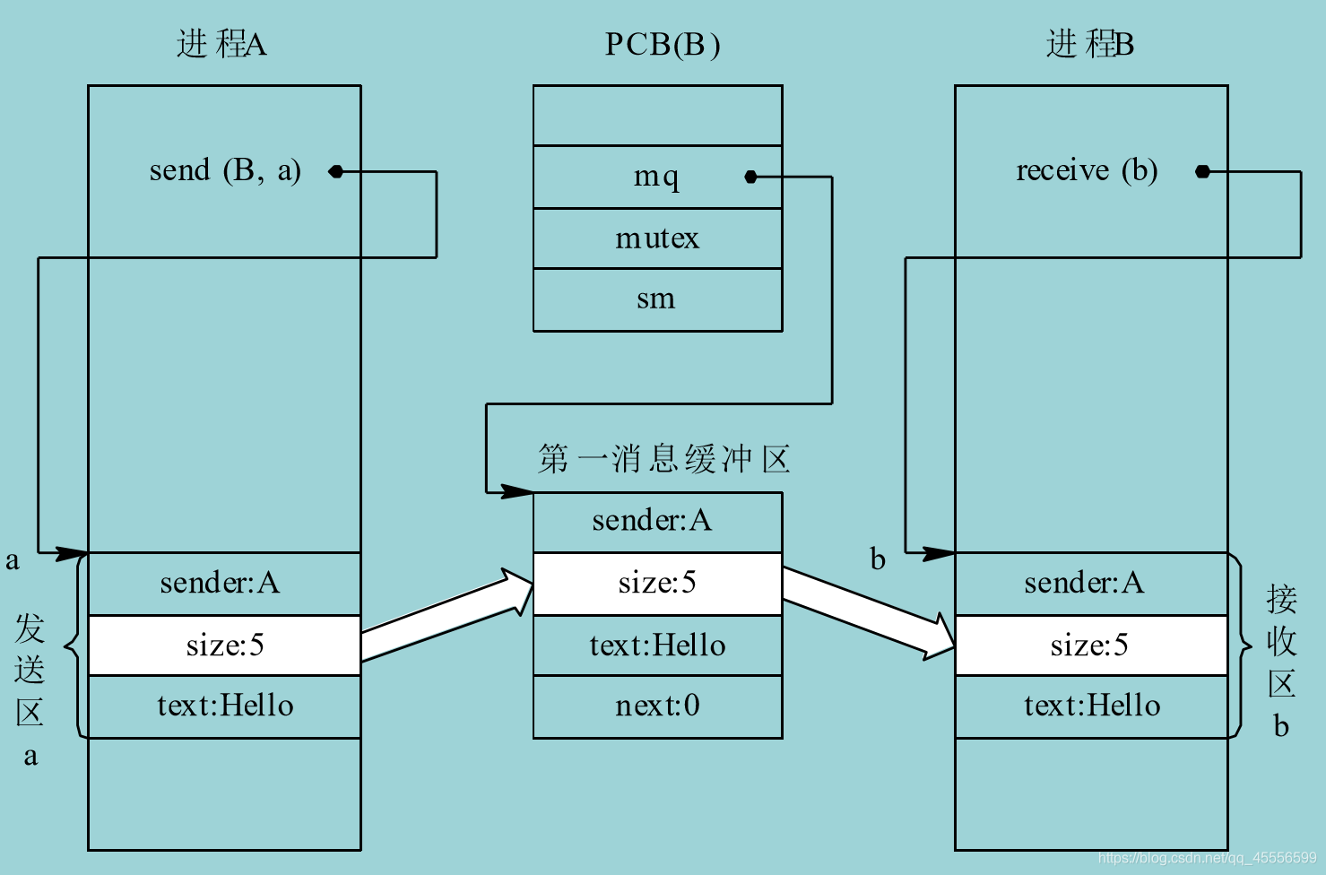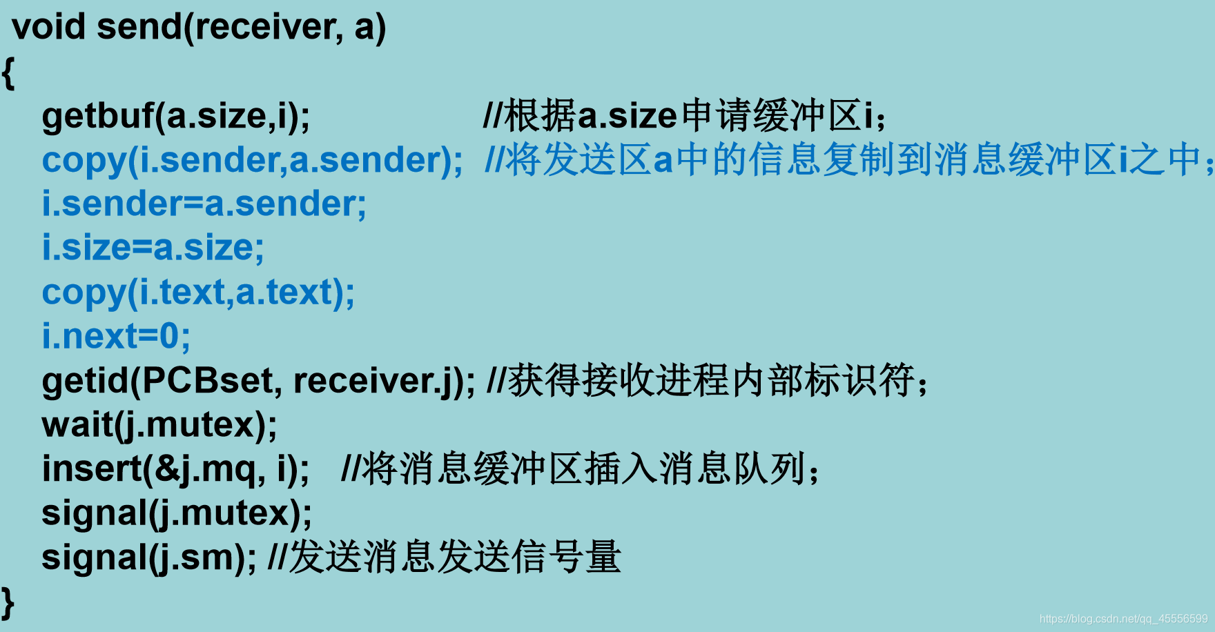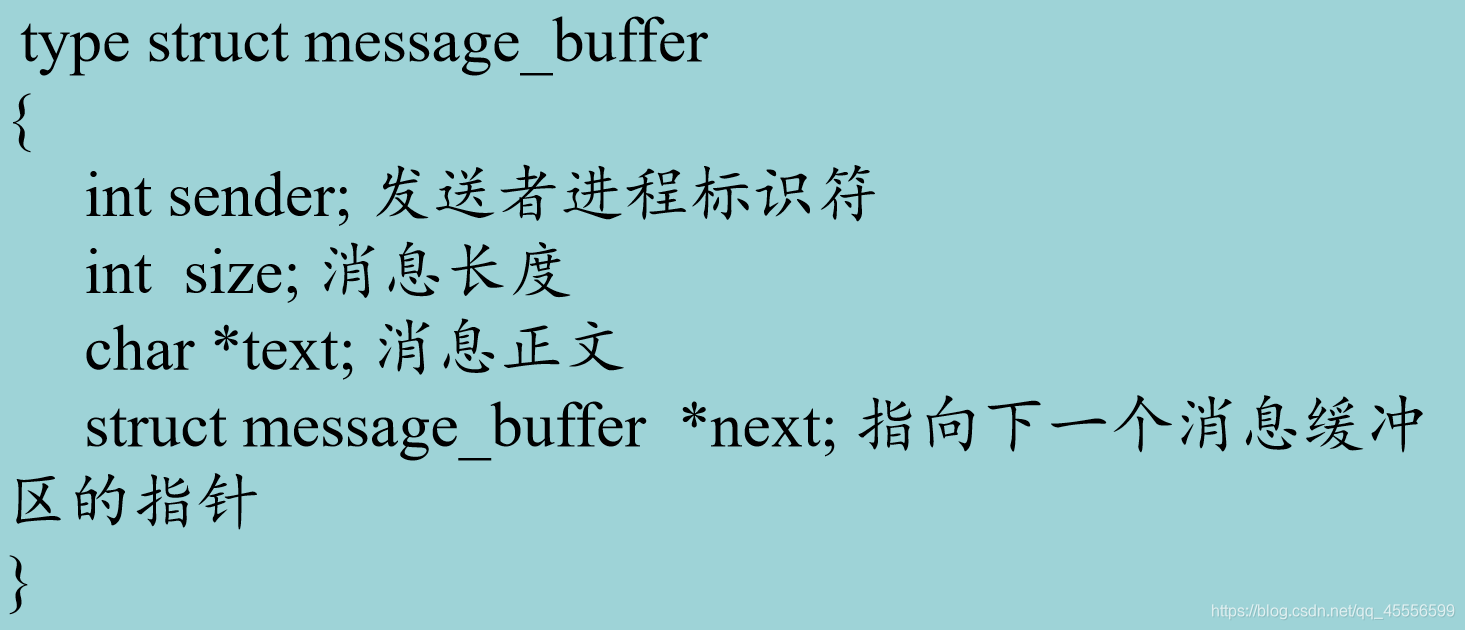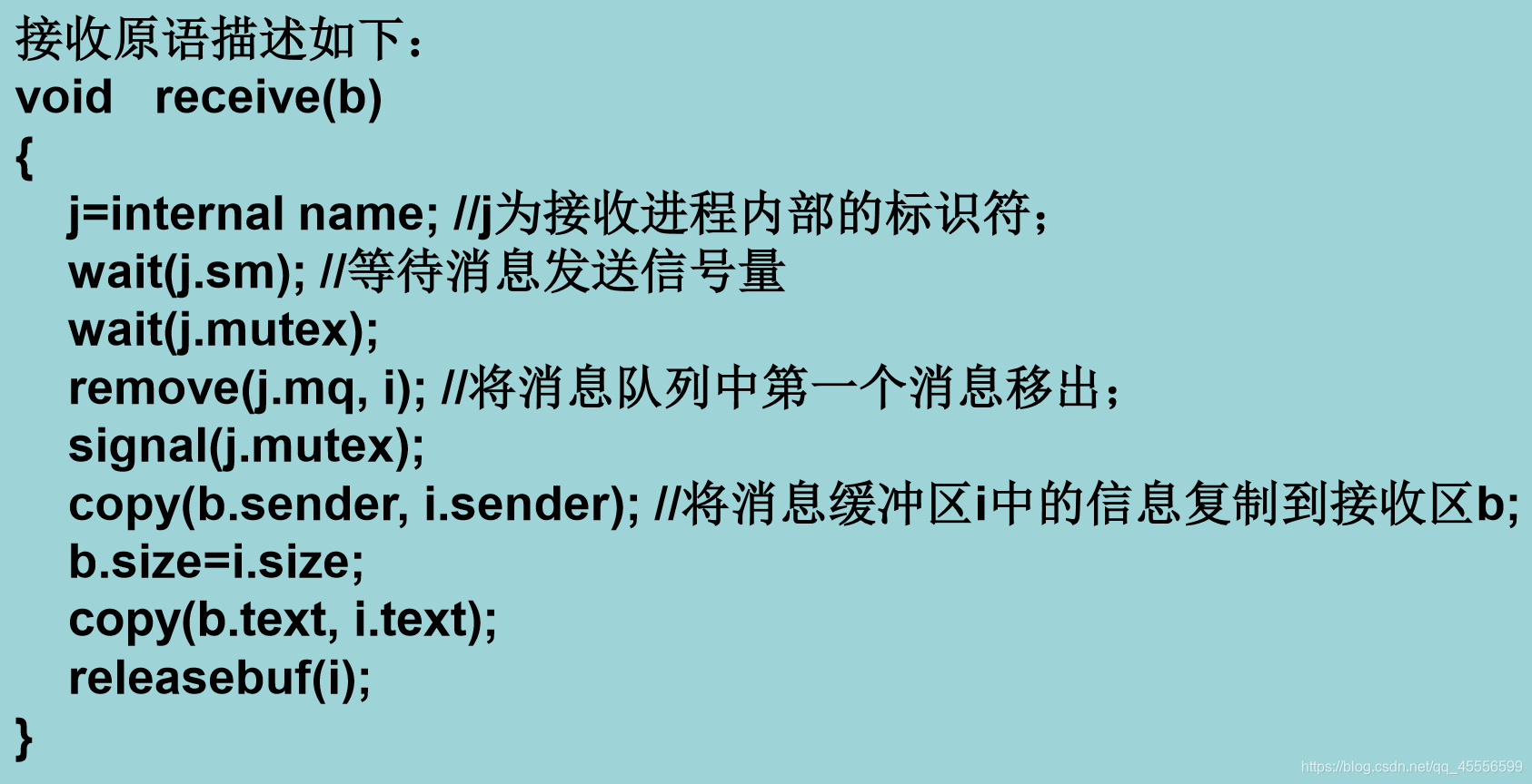 接收原语:receive (id, message); //可以接收来自任何进程的消息,id变量为发送方进程的 id 或名字。(2) 消息的格式