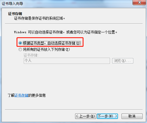 PS:浏览器证书导入时,证书存储位置选择第一个“根据证书类型,自动选择证书存储”。