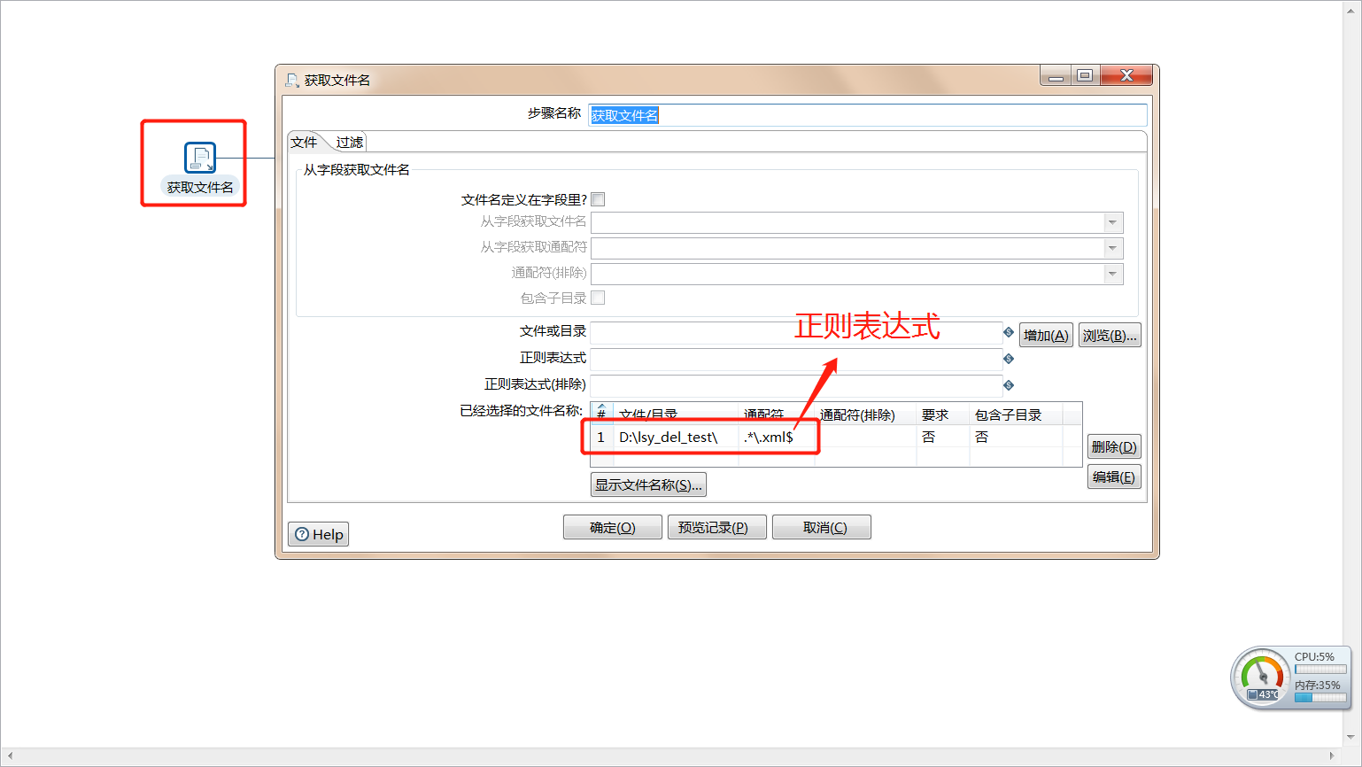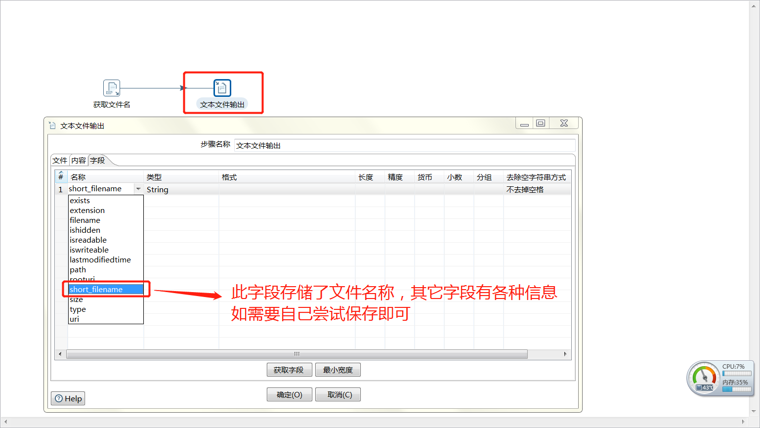 在转换中使用输入中“获取文件名”组件,用来获取下载到本地的文件夹中的文件名称,并将文件名输出到指定位置保存。