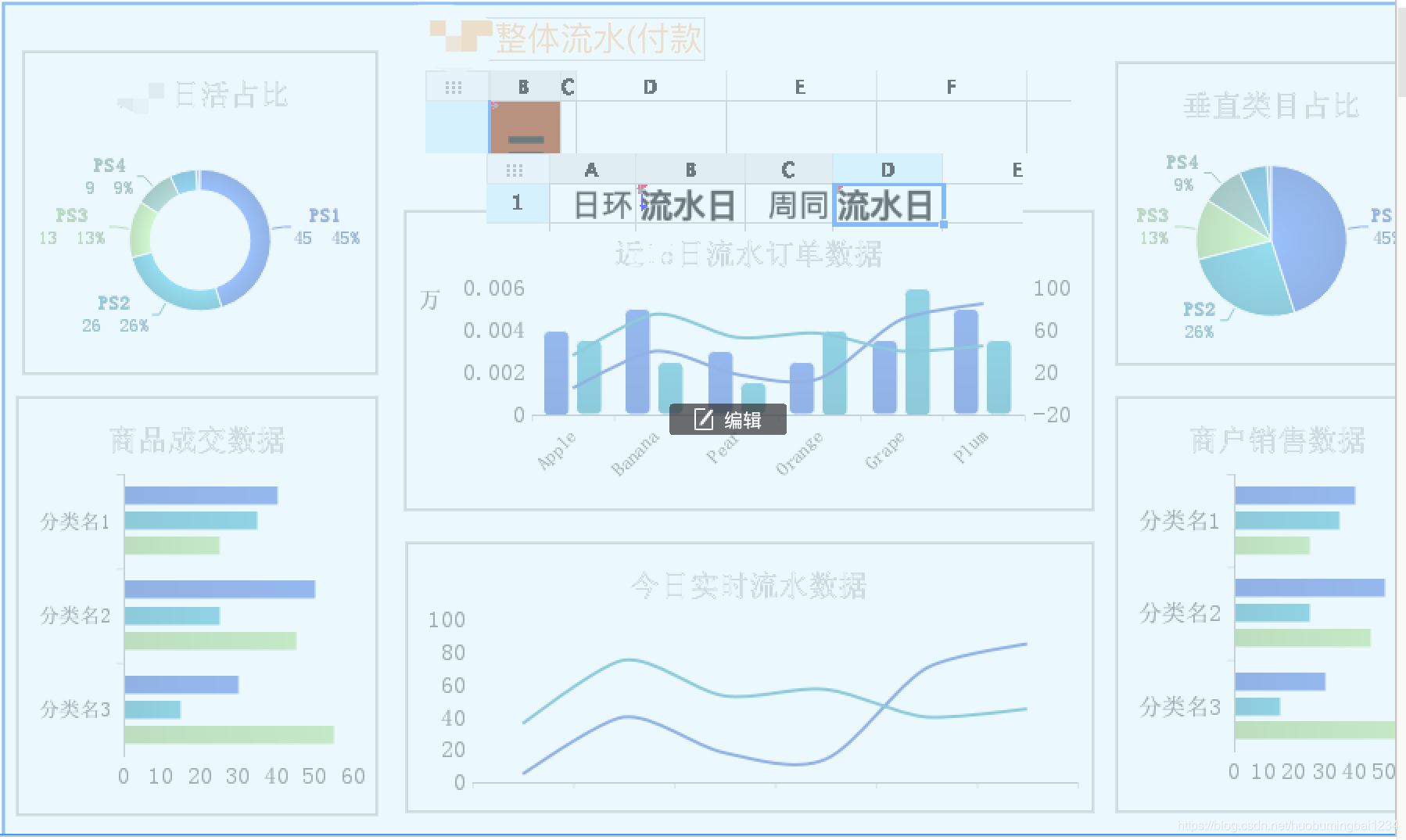 左上是日活,中间是流水分数字显示,其他的占比就是饼图,波动就是曲线,然后确定下每个块的大小
