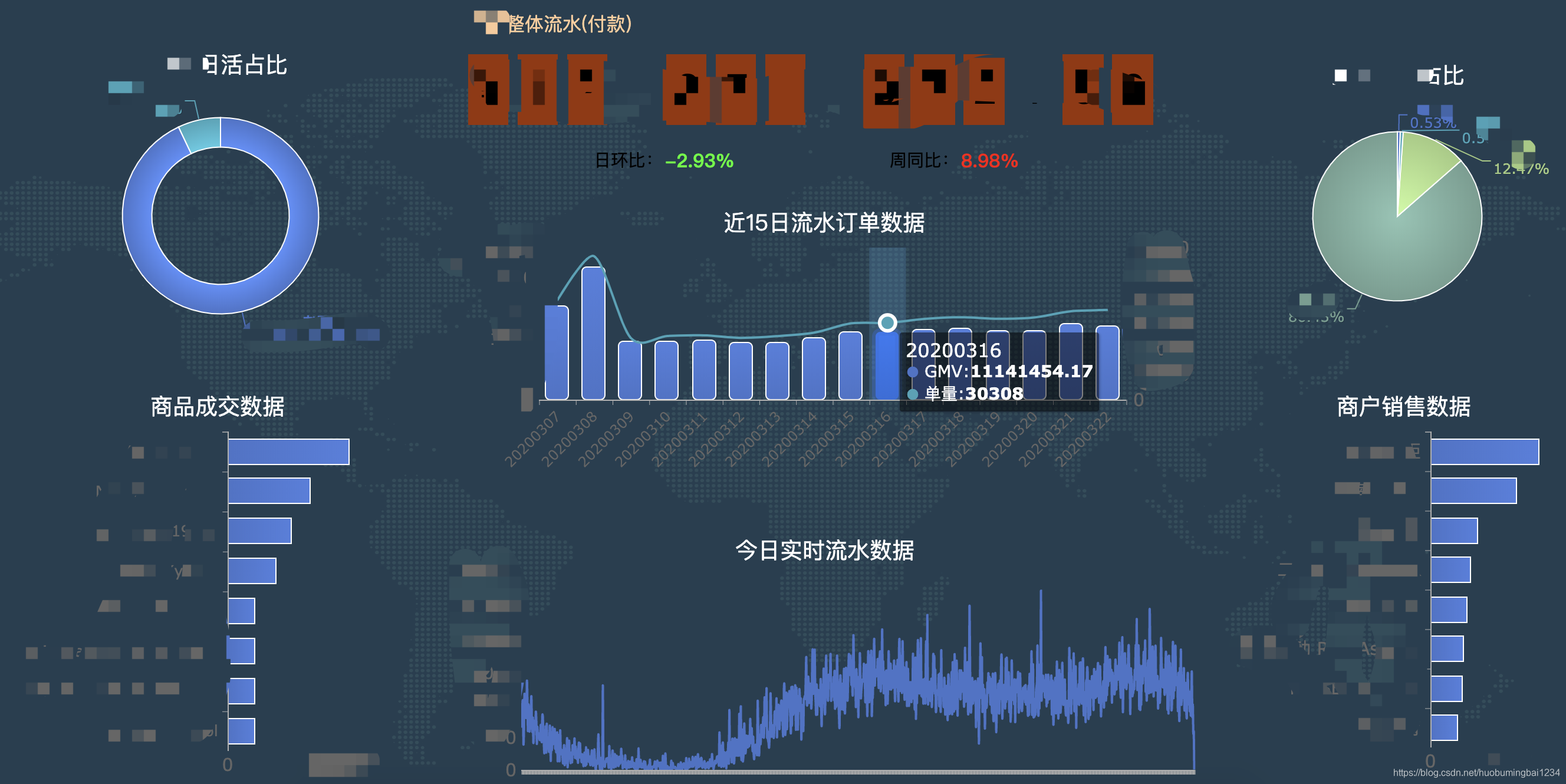 大屏主要展示哪些内容,还是要跟业务契合点,是领导或者同事在乎的东西,不能为了做而做。基于此,主要放日活,流水,各业务线流水,近14天相同时段流水,今日每分钟流水数据,商品销售榜,商户销售榜这8部分的数据。