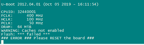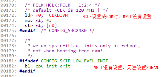 处理措施: 把MPLL的设置放到start.S里(设置),取消SDRAM前设置时钟,board_early_init_f里对MPLL的设置,修改如下: