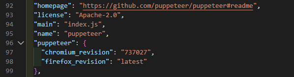 这里面非常多的版本号,看了网上的教程我们要选择合适的版本号(不知道随便下载一个可不可以),我们回到项目的根目录下面node_modules/puppeteer/package.json这个目录,查看一下我们的浏览器版本是多少。