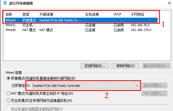按照如下图数字顺序,在桥接的下拉框内选中最开始查找的本地网卡名称,并选中。然后点击应用后保存退出。