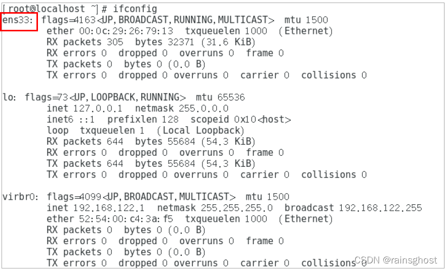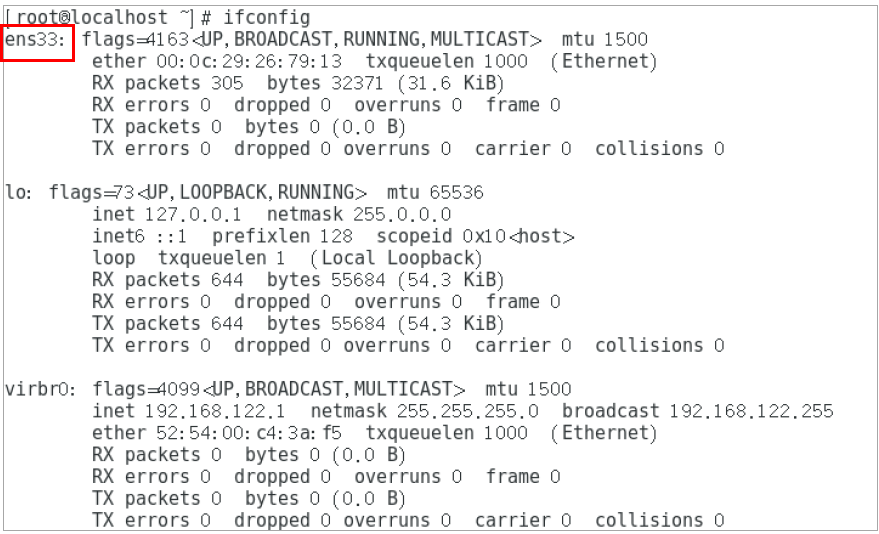网卡文件名称为:ifcfg-网卡名称,因为刚刚已经查看到我的网卡名称为ens33,