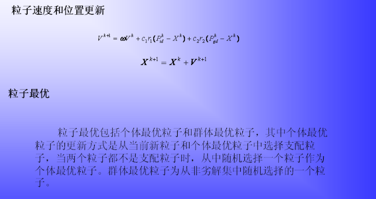 PSO 中,每个优化问题的解都是搜索空间中的一只鸟。我们称之为“粒子”。所有的粒子都有一个由被优化的函数决定的适应值(fitness value),每个粒子还有一个速度决定他们飞翔的方向和距离。然后粒子们就追随当前的最优粒子在解空间中搜索。 PSO 初始化为一群随机粒子(随机解),然后通过迭代找到最优解,在每一次迭代中,粒子通过跟踪两个“极值”来更新自己。第一个就是粒子本身所找到的最优解,这个解叫做个体极值 p Best,另一个极值是整个种群目前找到的最优解,这个极值是全局极值 g Best。另外也可以不用整个种群而只是用其中一部分最优粒子的邻