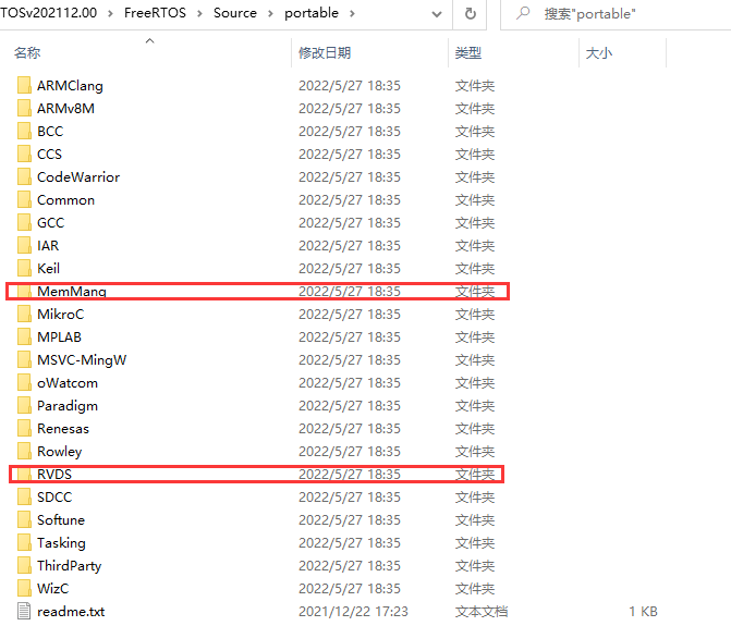 3)在portable文件夹中,选择与Keil开发环境相关的文件RVDS, 其中Keil文件夹中已说明,RVDS和Keil一致;选择与内存管理相关的文件夹MemMang复制到新建的port文件中。