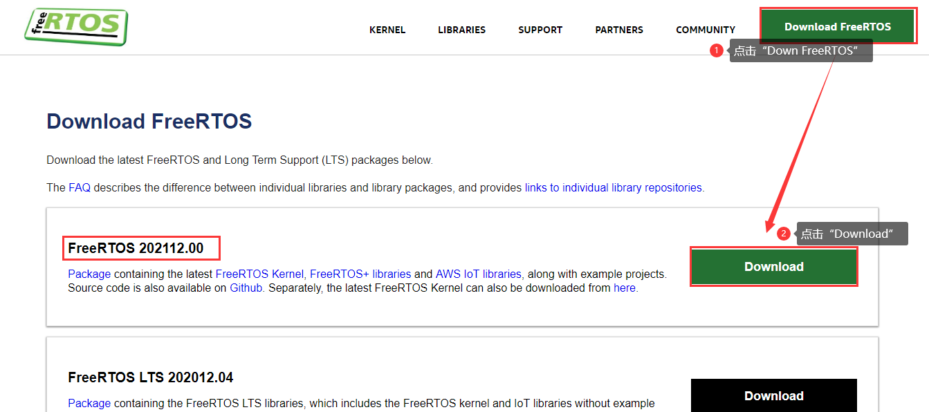点击下载链接:FreeRTOS链接,进入FreeRTOS官网首页,点击“Download FreeRTOS”,选择 FreeRTOS 202112.00 进行下载。