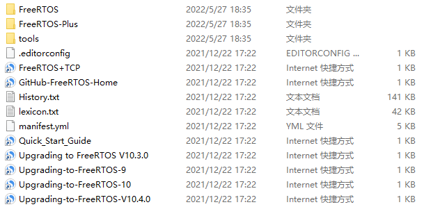 下载的 FreeRTOS 202112.00 文件夹大小约为80M左右,将其解压可以看到如下图所示的文件夹列表。