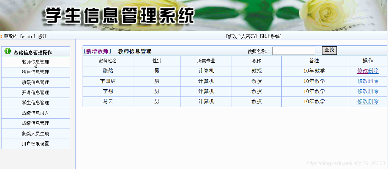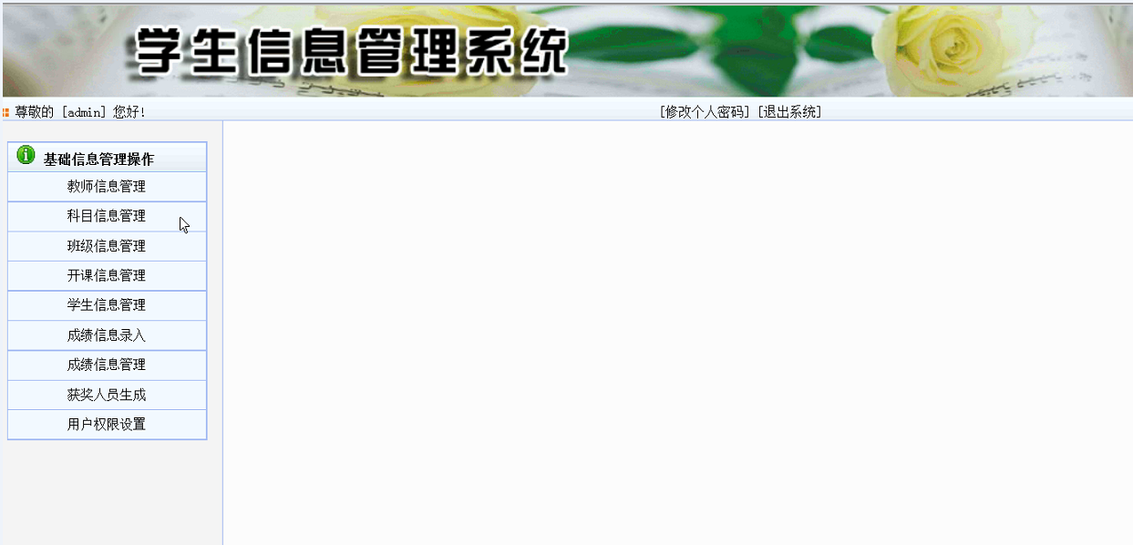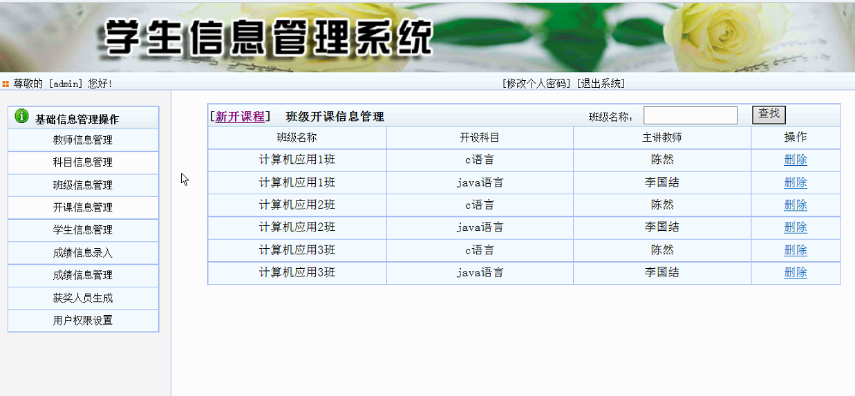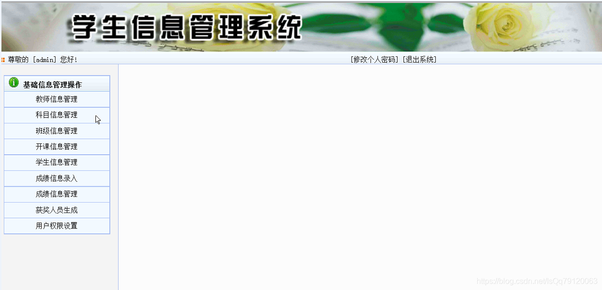 管理员子系统完成此系统的管理维护操作,主要包括学生信息管理模块,课程管理模块,班级信息的模块,成绩管理模块,教师管理模块,获奖人员生成,开课信息管理。管理员子系统的的功能结图如图4-2所示: