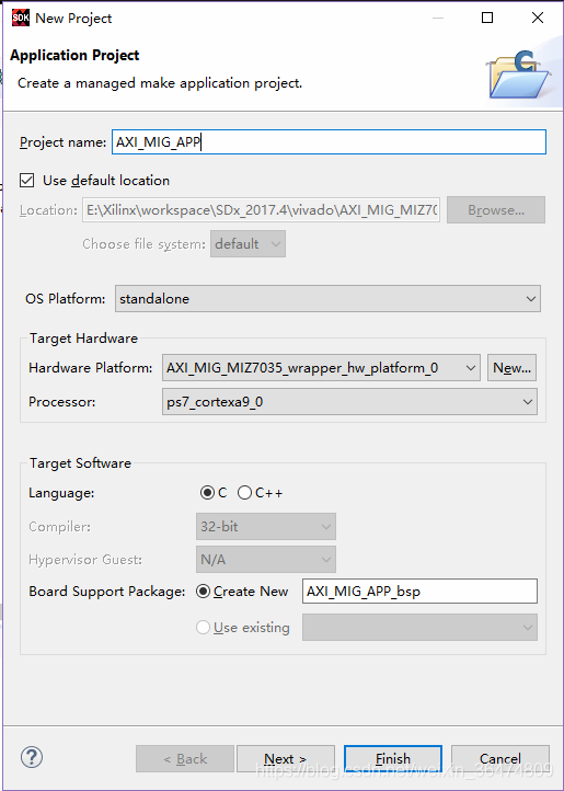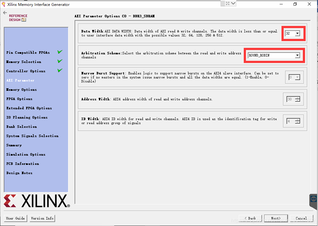 AXI的Data Width选择64位和PS的HP接口对应,或者32位和GP接口对应,地址线读写仲裁选择ROUND_ROBIN,其他默认
