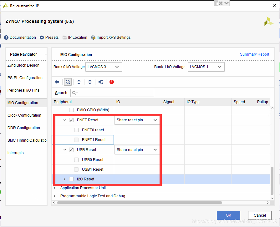 外设复位,ENET上电复位;USB复位在PL上,而这里只能选PS的MIO引脚,所以忽略;没有I2C,取消掉