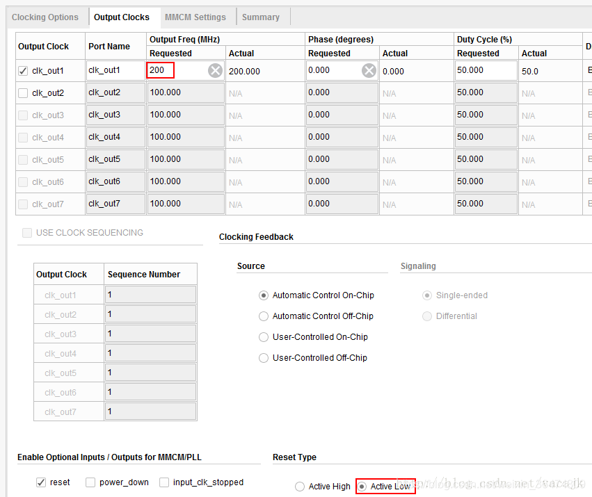 因为PL DDR3的参考时钟配置的是200MHz,这里让MMCM输出200MHz,并将Reset设置为低有效