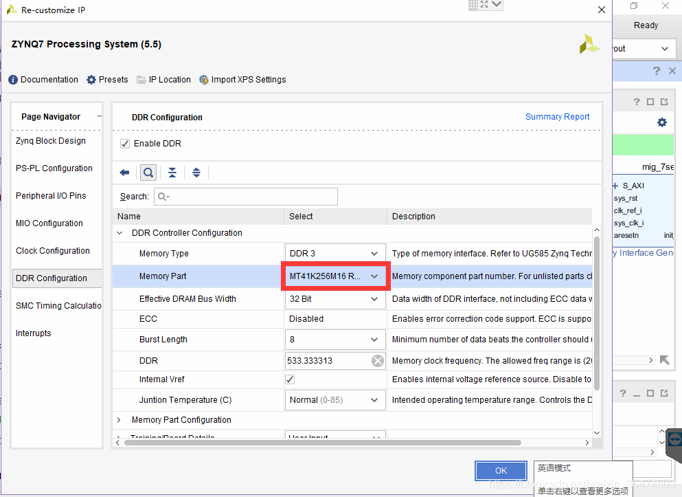 默认设置800MHz时钟,然后修改Memory Part为MT41K256M16XX-125,Data Width选择32位,其他设置默认