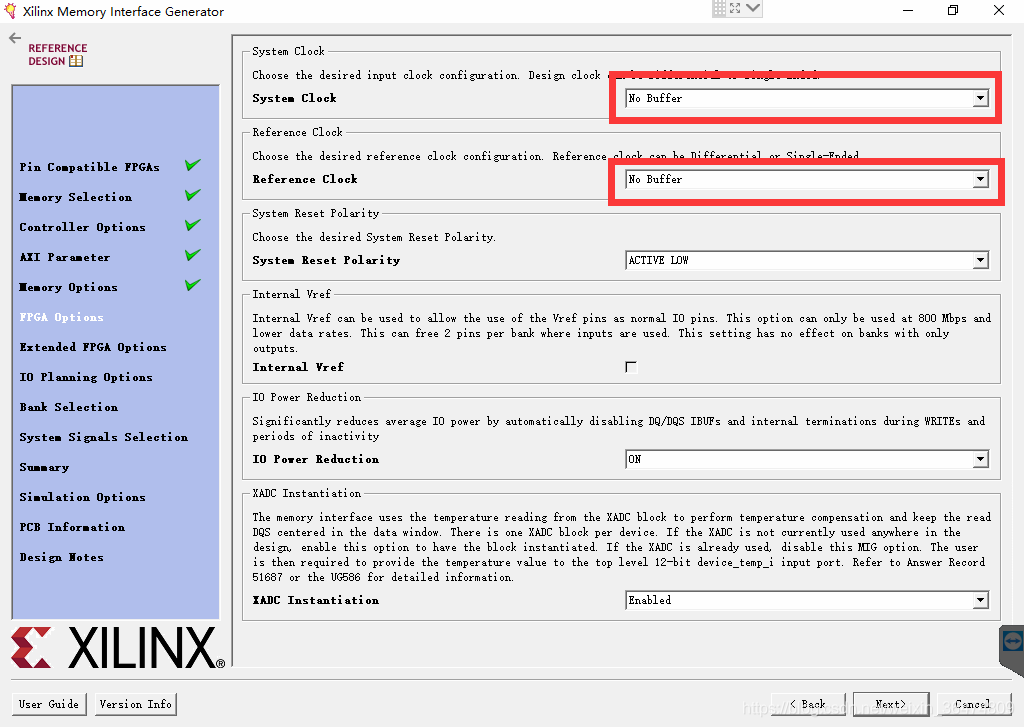 系统时钟和参考时钟来源于FPGA内部,这里选择No Buffer,其他默认