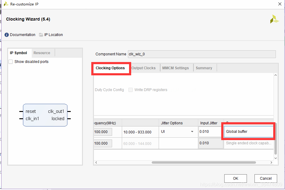 双击IP进行配置,外部GCLK的100MHz时钟,因为直接接入了时钟引脚,选择Global Buffer
