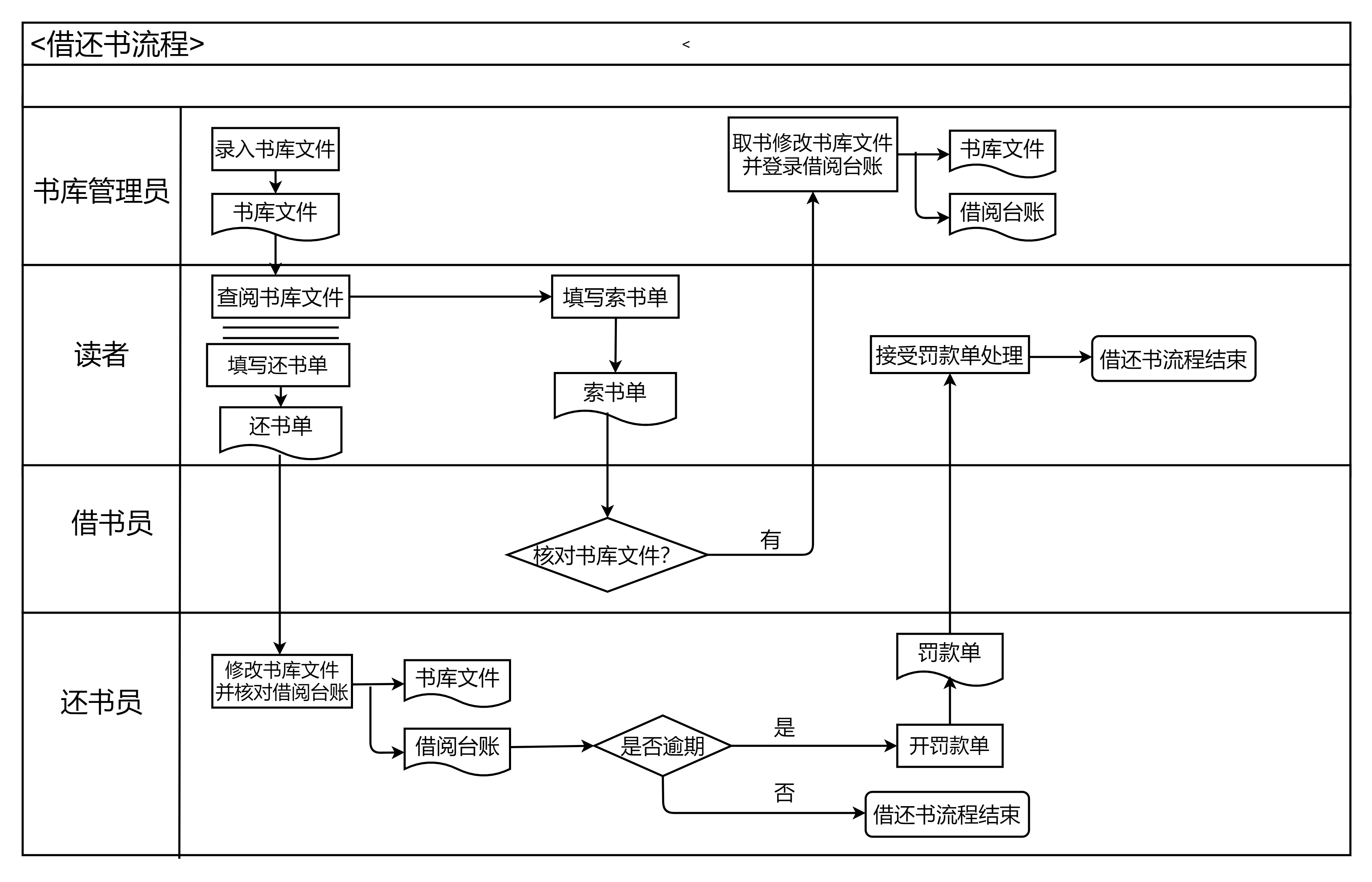 借还书的业务处理过程如下:由读者查阅书库文件(图书号、书名、作者、出版社、总数量、在库数量)填写索书单,借书员核对书库文件后交书库管理员,管理员取书后修改书库文件,登录借阅台帐;读者填写还书单交还书员,还书员核对并修改借阅台帐,修改书库文件,对逾期者开罚款单,罚款处理。试画出业务流程图。