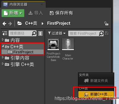 3.在内容浏览器面板选择文件夹创建c++类,我打开引擎显示C++类,在C++类文件夹下创建。