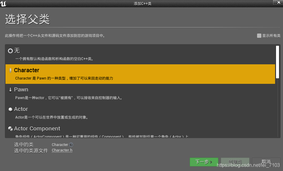 4.选择父类:选择源自哪个C++类,并命名创建的类