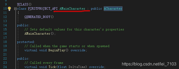 5.打开vs后,会发现在类名上会增加一个前缀A,这是因为源自Actor的类,名称前均会被自动加上A,ACharacter类也是Actor的子类。