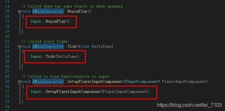6.在创建的C++类中(.cpp),定义了BeginPlay、Tick、SetupPlayerInputComponent,在方法体中都有语句,方法体中的语句是代表:当本类的方法被调用时,也会调用父类中的方法。