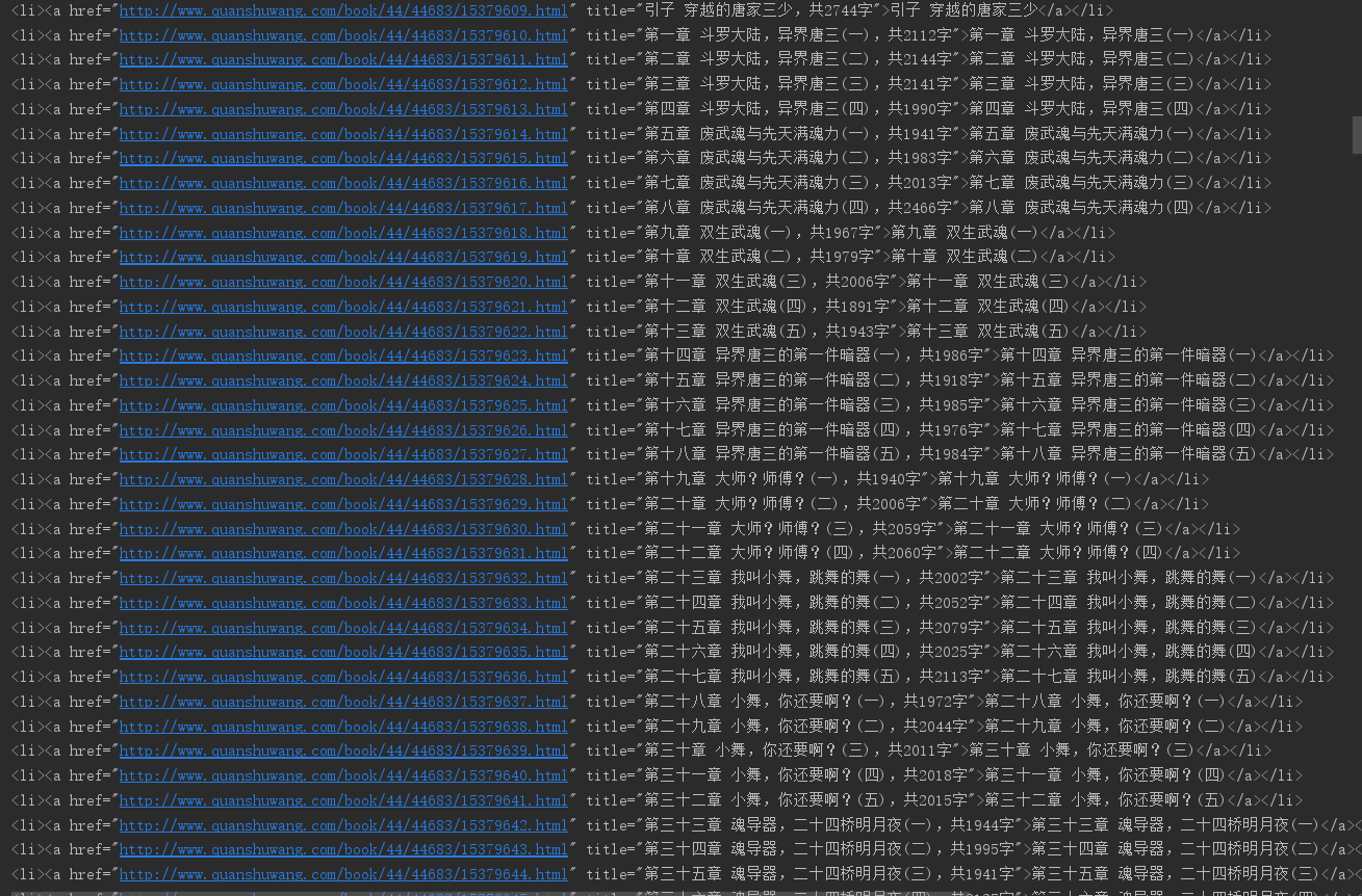 在输出地HTML文件中我们可以清晰看到每个章节的 url,但是你要知道,将近700章的内容,也就是有近700个 url,很显然,一个一个手动获取是不现实的。