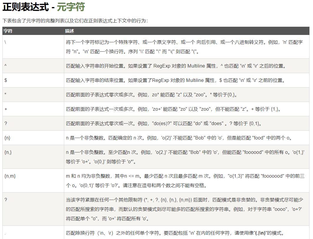 这里给出常见的部分元字符供大家参考: