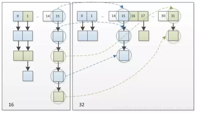 因此,我们在扩充HashMap的时候,不需要像JDK1.7的实现那样重新计算hash,只需要看看原来的hash值新增的那个bit是1还是0就好了,是0的话索引没变,是1的话索引变成“原索引+oldCap”,可以看看下图为16扩充为32的resize示意图: