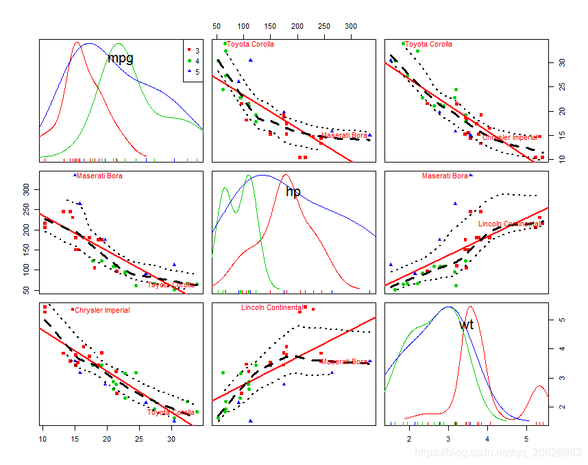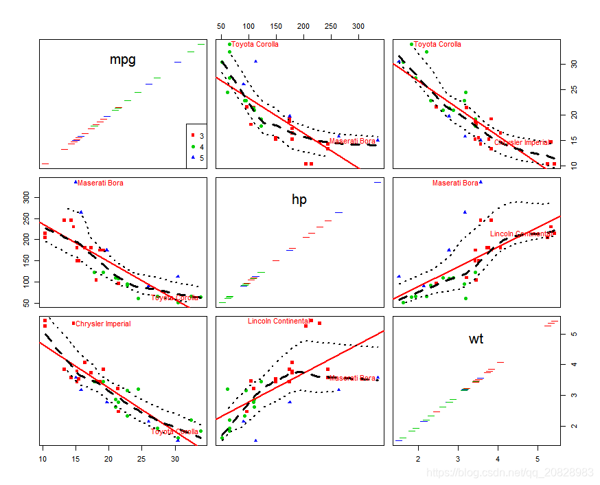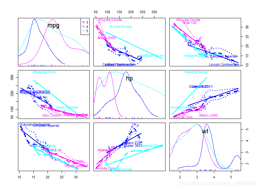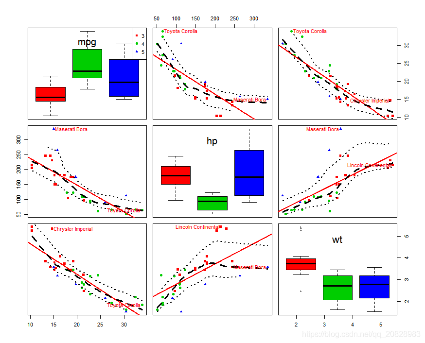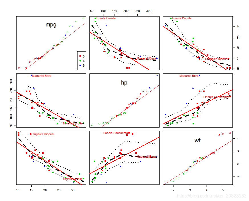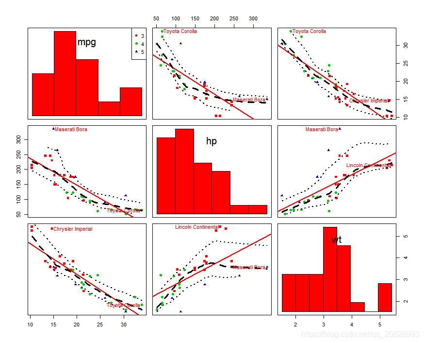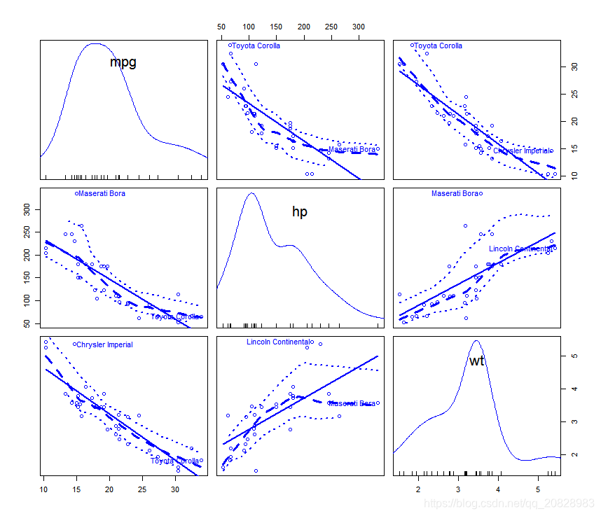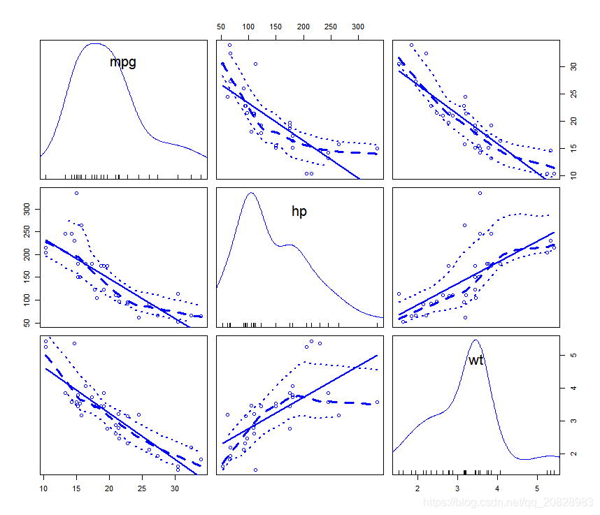 car::scatterplotMatrix(mtcars[c("mpg", "hp", "wt")])结果如图: