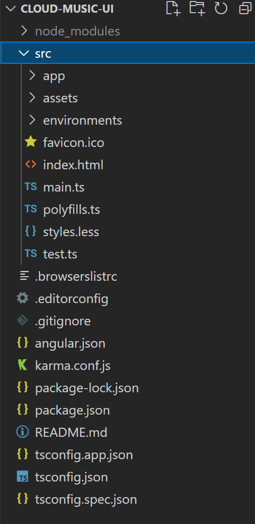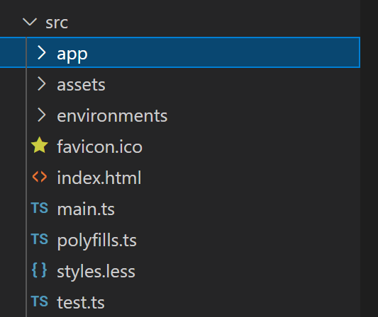 environments目录 环境配置。Angular是支持多环境开发的,我们可以在不同的环境下(开发环境,测试环境,生产环境)共用一套代码,主要用来配置环境的