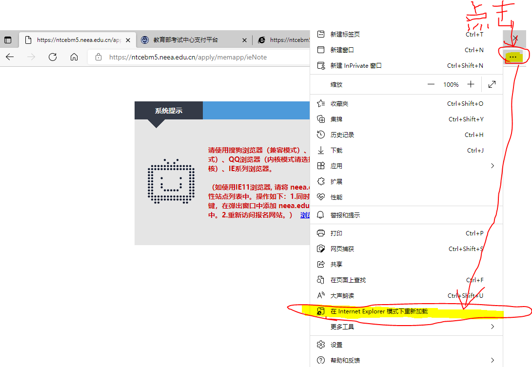 3.在IE浏览器的Microsoft Edge模式,直换成Internet Explorer模式就可进入教资网站