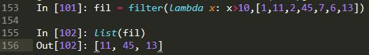 在函数中设定过滤条件,逐一循环迭代器中的元素,将返回值为True时的元素留下,形成一个filter类型数据。