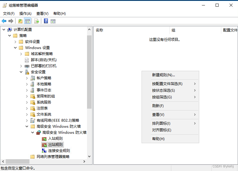 9:计算机配置--->策略--->Windows设置--->安全设置--->高级安全Windows防火墙--->高级安全Windows防火墙--->出站规则,中右键新建一个规则。