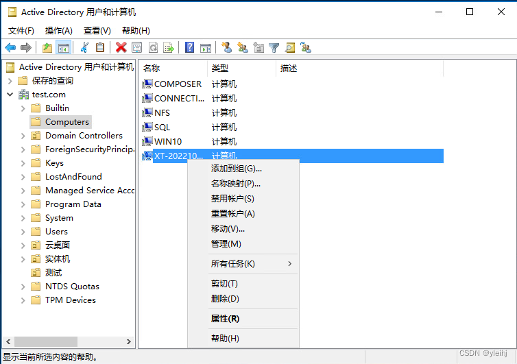 2:准备在测试OU中进行实验,找到一台计算右键移动。