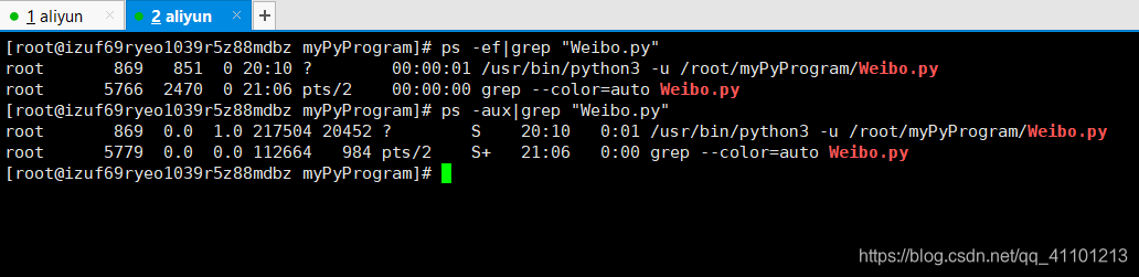 ps -aux|grep "Weibo.py" # 会显示开始运行时间,结束时间等