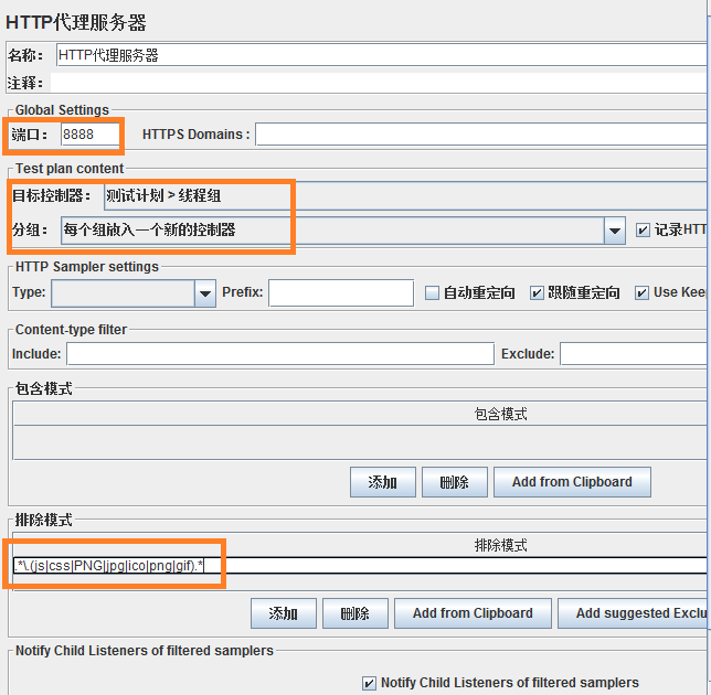5、Http代理服务器: Jmeter选中工作台,右键添加“非测试元件”的“HTTP代理请求”,进行设置 设置如下: (1)、端口:默认8888 和浏览器代理的端口一致 目标控制器:测试计划->线程组 分组:每个组放入一个新的控制器 (2)、过滤掉JS,CSS等请求,排除模式:.*\.(js|css|PNG|jpg|ico|png|gif).* (设置排除模式,若不设置,在录制完之后,可以把不需要的.css .jpg的请求手动删掉。) (3)、点击”启动”,进行录制脚本