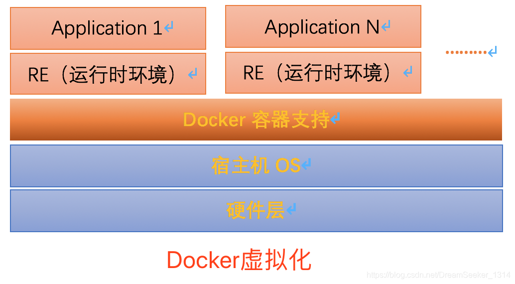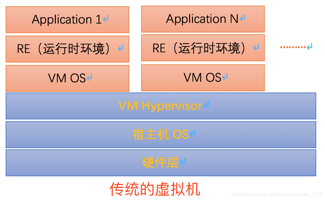 传统方式是在硬件层面实现虚拟化,需要有额外的虚拟机管理应用和虚拟机操作系统层。