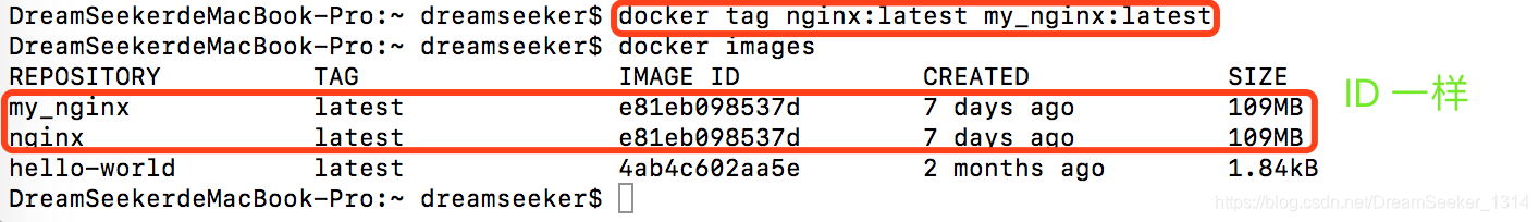 为了方便在后续工作中使用特定镜像,还可以使用docker tag命令来为本地镜像任意添加新的标签。这些myubuntu:latest镜像的ID跟ubuntu:latest 完全一致。它们实际上指向同一个镜像文件,只是别名不同而已。docker tag 命令添加的标签实际上起到了类似链接的作用。docker tag ubuntu:latest myubuntu:latest